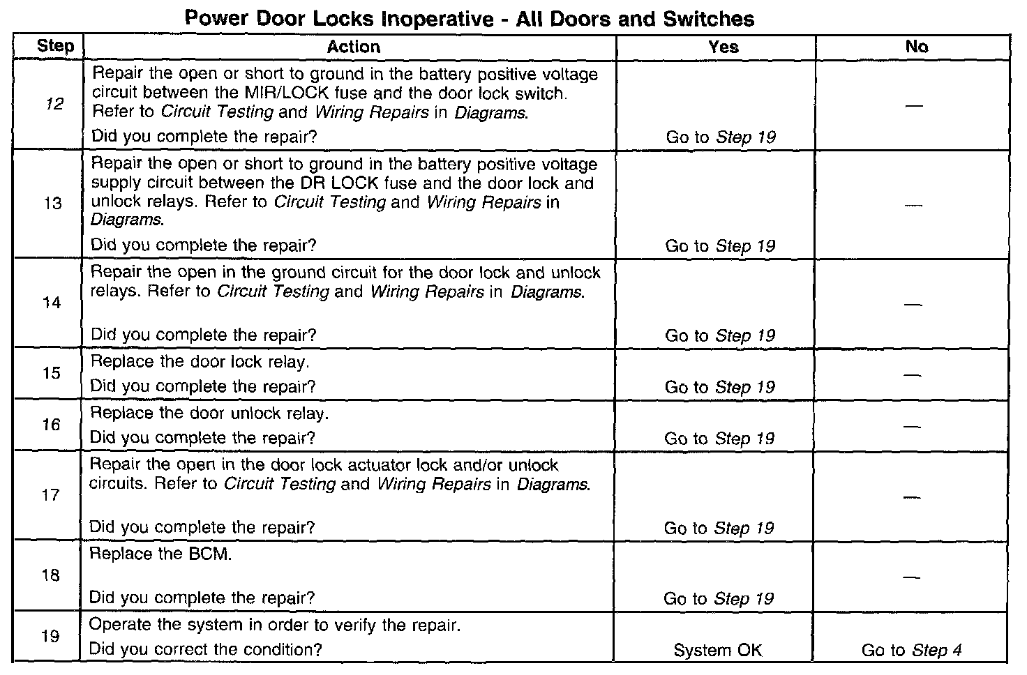 12. The MIR/LOCK fuse supplies battery positive voltage for the power mirrors, power door lock switches and the memory seat switch (if equipped). If the MIR/LOCK fuse is open, all systems on the fuse would be inoperative. The fault could be a short to ground in the battery positive voltage circuit, however, a short to ground in the power mirror motor control or the memory seat control circuits could also be the cause if the fuse opens after any of the switches are activated. If a short to ground exists in either the door lock or unlock relay control circuits, a DTC (B3137 or B3147) would set when the BCM commands a lock or unlock function.