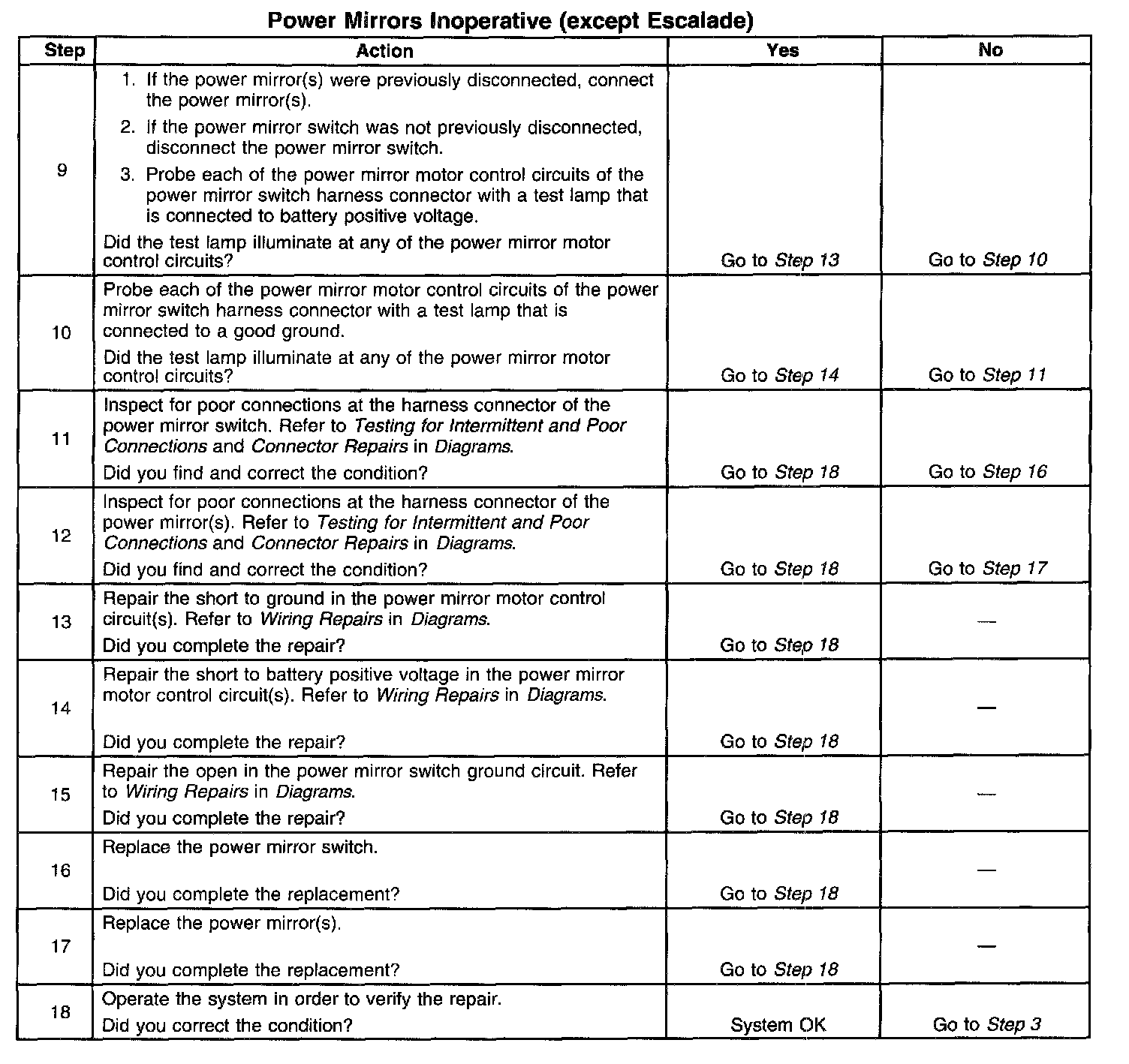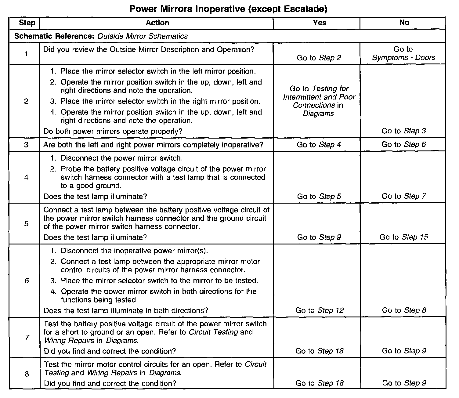^ If both power mirrors are inoperative on one or more axis, the most probable cause is a power mirror switch failure. However the fault could be an open circuit on 2 or more of the power mirror control circuits.