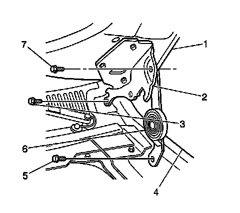 5. Remove the bolt holding the hood hinge to the hood link assembly (7).