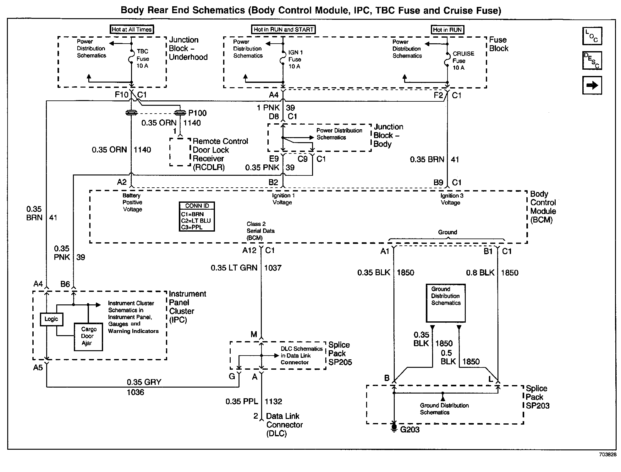 Body Rear End Schematics: Body Control Module, IPC, TBC Fuse and Cruise Fuse: