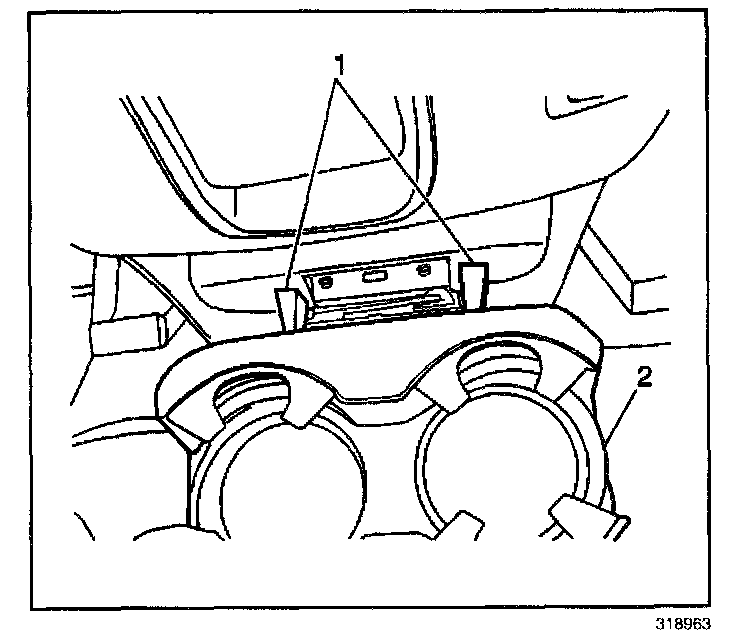 2. Remove the tabs (1) that connect the cupholder to the floor console by gently prying apart with a flat bladed tool.