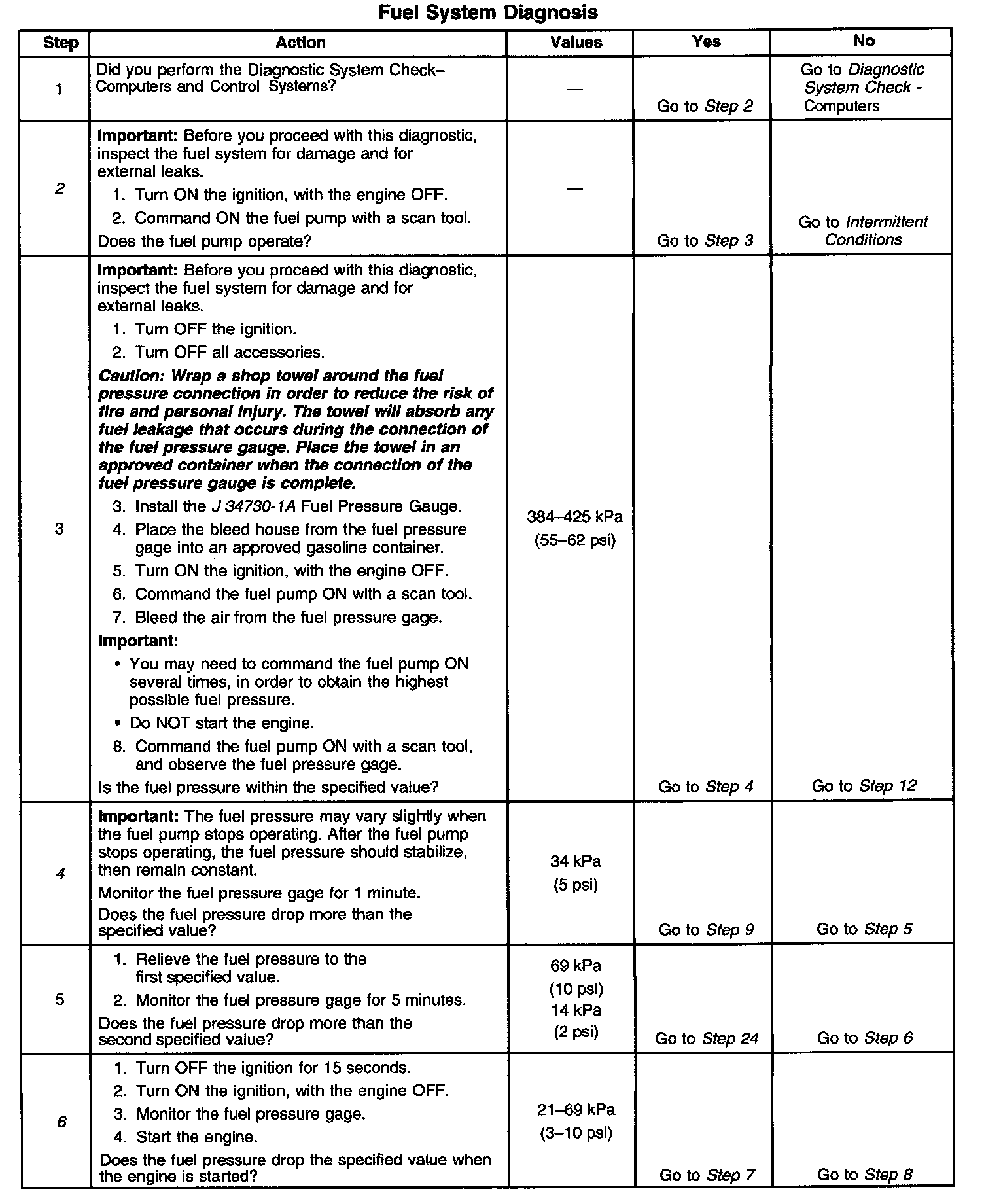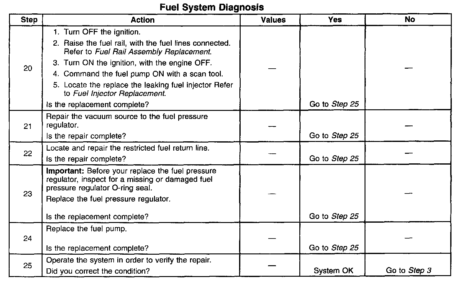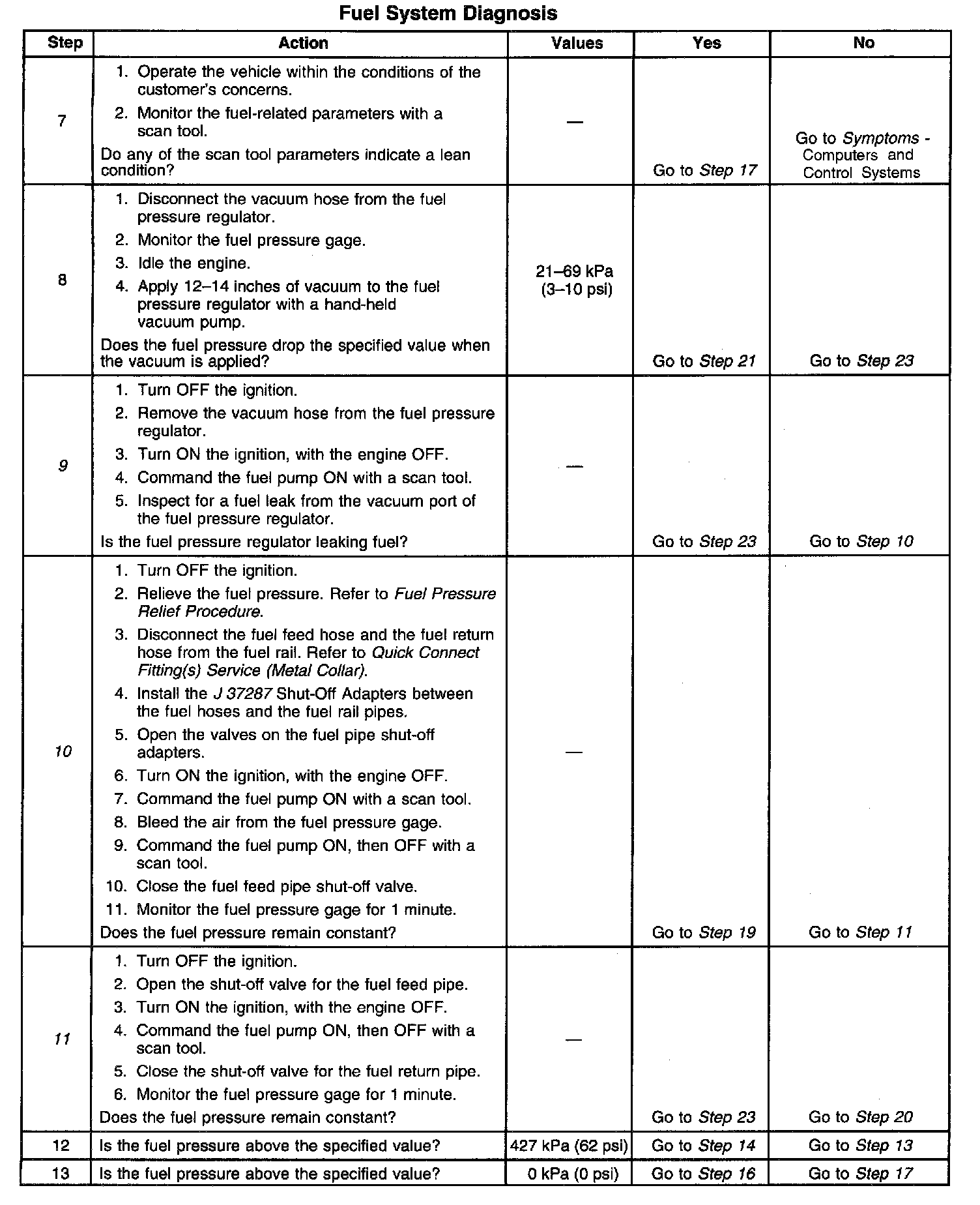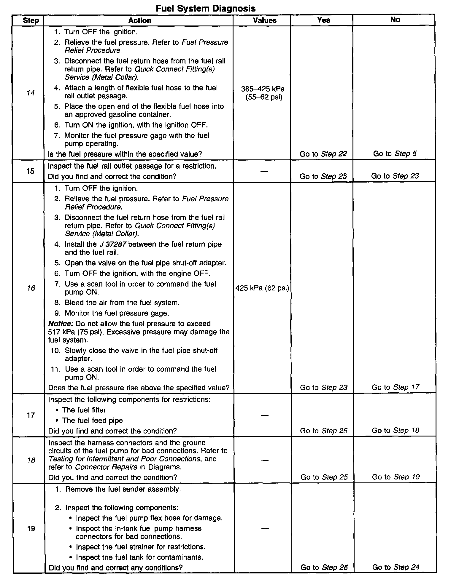 14. This step tests for a restricted fuel return pipe. If the fuel pressure is within the specified values, there is a restriction in the fuel return pipe.