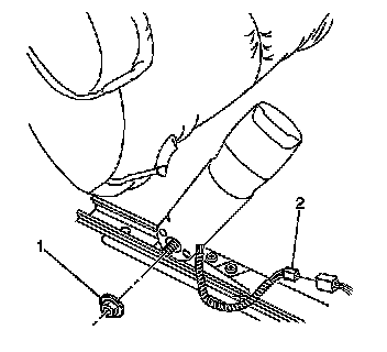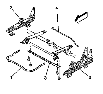 8. Remove the bar (1) from the adjuster tracks (2). Straighten the tabs in order to remove the bar.