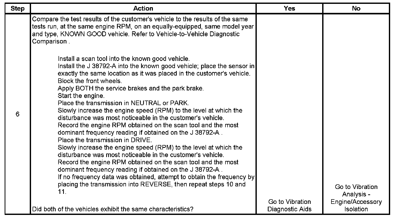 6. Making comparisons of the customer's vehicle with an equally equipped, same model year and type, KNOWN GOOD vehicle will help determine if certain disturbances may be characteristic of a vehicle design.