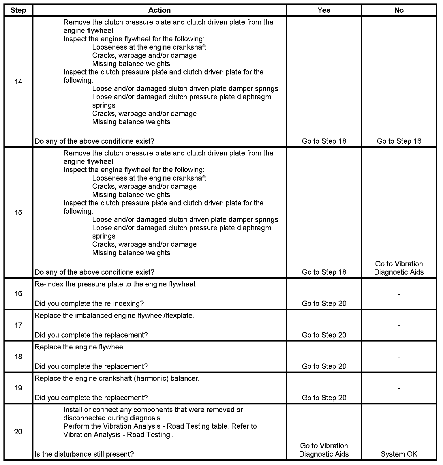 14. An engine flywheel that is loose at the engine crankshaft or that is cracked, damaged and/or missing balance weights; and/or a clutch pressure plate and clutch driven plate that has loose springs, cracks, warpage, damage and/or missing balance weights - when their mass is combined, can produce a disturbance.