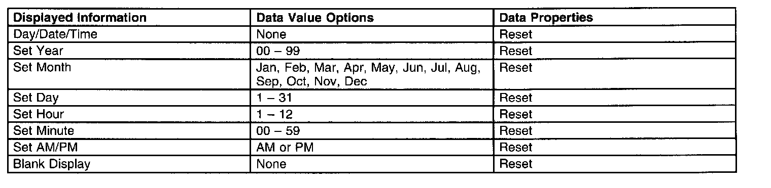 The Set Day/Date/Time initializes and/or resets the Day/Date/Time display using the Reset button. The DIC internally maintains the clock function. The Set Day/Date/Time displays appear in the above order:
