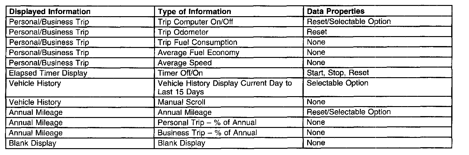 The DIC Personal/Business Trip Mode displays five vehicle information parameters in order as listed in the table above. When the Trip Mode button is pressed the first Personal/Business Trip parameter displayed is the Trip Computer On/Off. This feature will turn any Personal/Business parameter (i.e. Trip Odometer, Trip Fuel Consumption, Average Fuel Economy, Average Speed) On or Off. When the Trip Computer On/Off parameter is displayed and the On/Off button is pressed, the status of all other Personal/Business Trip parameters will also change. Every time any Personal/Business Trip parameter is selected and reset, all other Personal/Business Trip parameter data values are reset. There are two methods for resetting the Personal/Business Trip parameter data values: