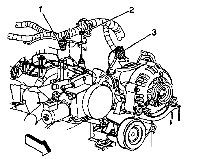 31. Disconnect the main coil harness (2) and fuel injector (3) electrical connectors on the left side.
