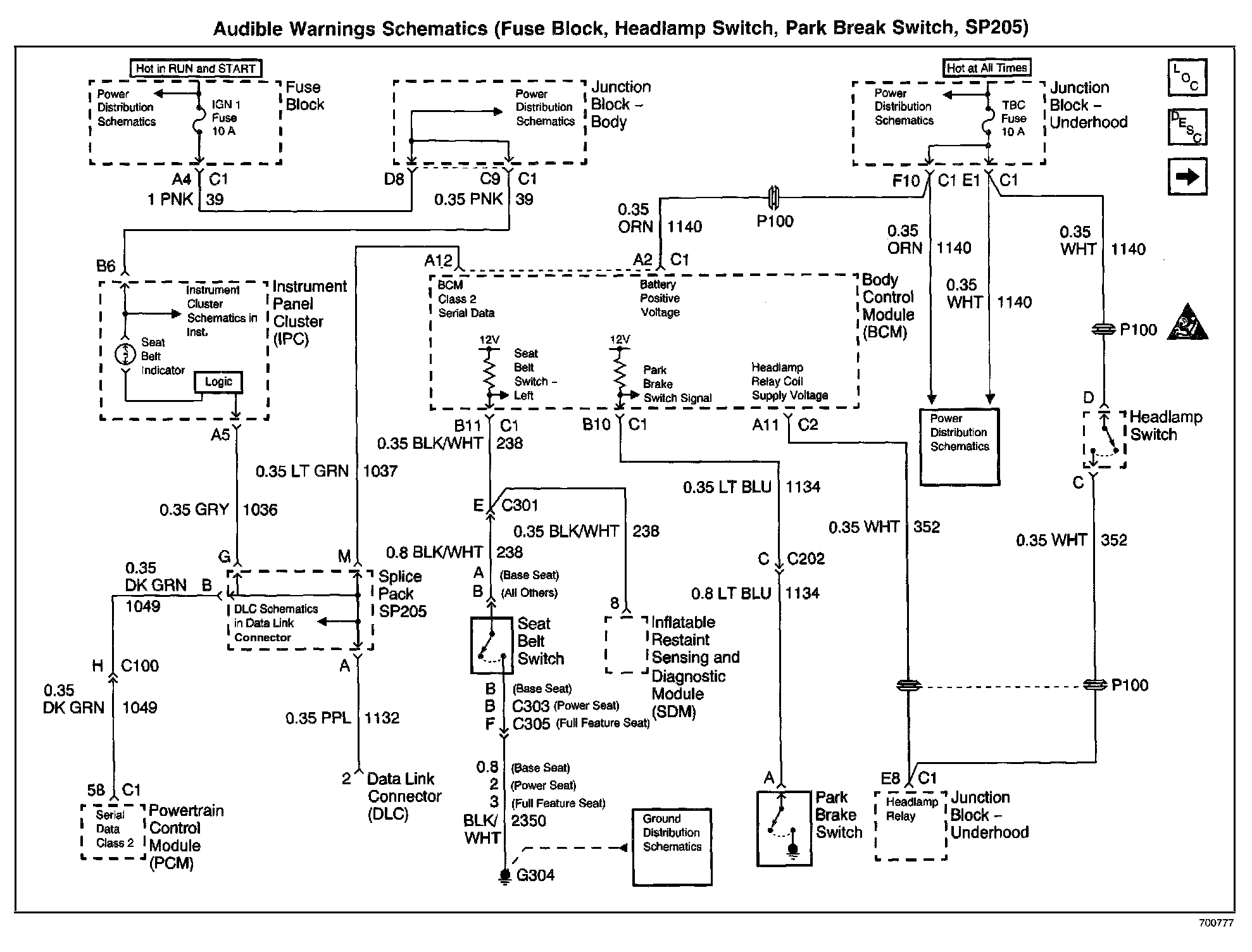 Audible Warnings Schematics: Fuse Block, Headlamp Switch, Park Brake Switch, SP205: