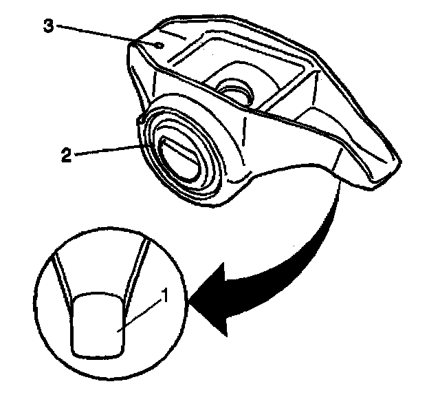 5. Inspect the valve rocker arm pushrod sockets (3) and valve stem mating surfaces (1). These surfaces should be smooth with no scoring or exceptional wear.