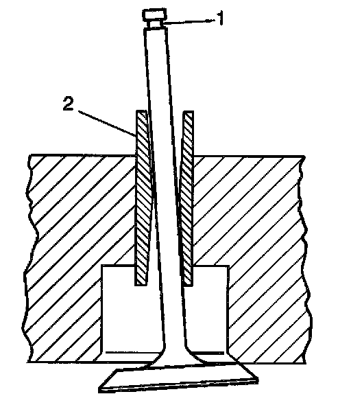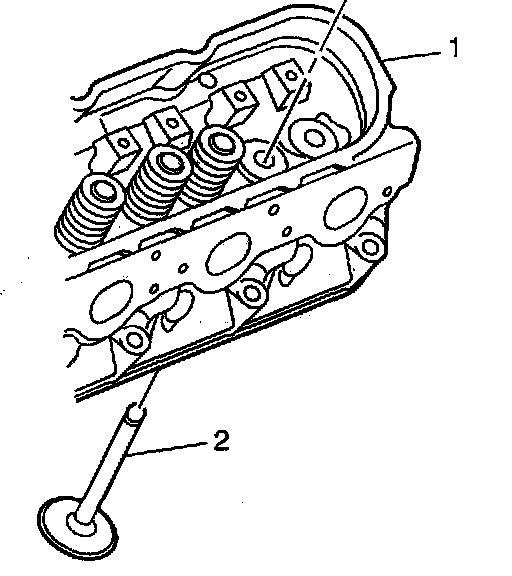 2. A valve stem (1) and guide (2) with excessive clearance must be replaced or the components replaced.