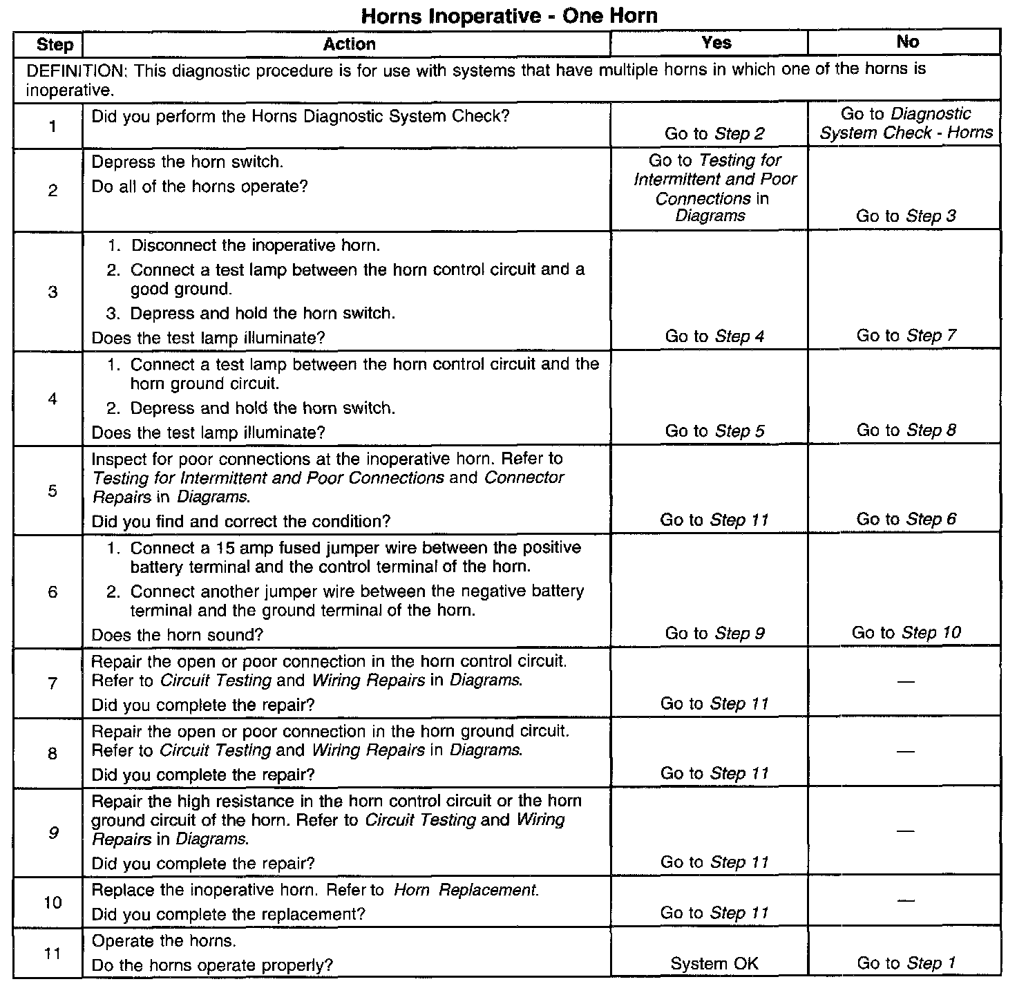 9. The horns need maximum current flow to operate properly. A high resistance (greater than 0.5 Ohms) in the horn control circuit or the horn ground circuit could cause operating problems with the horns. Inspect the circuits for faults that would restrict current flow.