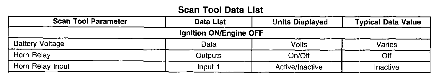 The Horns Scan Tool Data List contains all horn related parameters that are available on the scan tool. The parameters in the list are arranged in alphabetical order. The column, "Data List," indicates the location of the parameter within the scan tool menu selections. Use the Horns Scan Tool Data List as directed by a diagnostic table or in order to supplement the diagnostic procedures. Begin all of the diagnostic procedures with Diagnostic System Check - Horns.