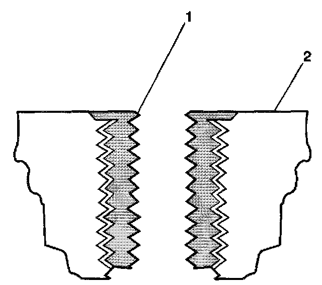 The thread repair process involves a solid, thin walled, self-locking, carbon steel, bushing type insert (1). During the bushing installation process, the driver too[ expands the bottom external threads of the insert into the base material (2). This action mechanically locks the insert in place. Also, when installed to the proper depth, the flange of the insert will be seated against the counterblow of the repaired hole.