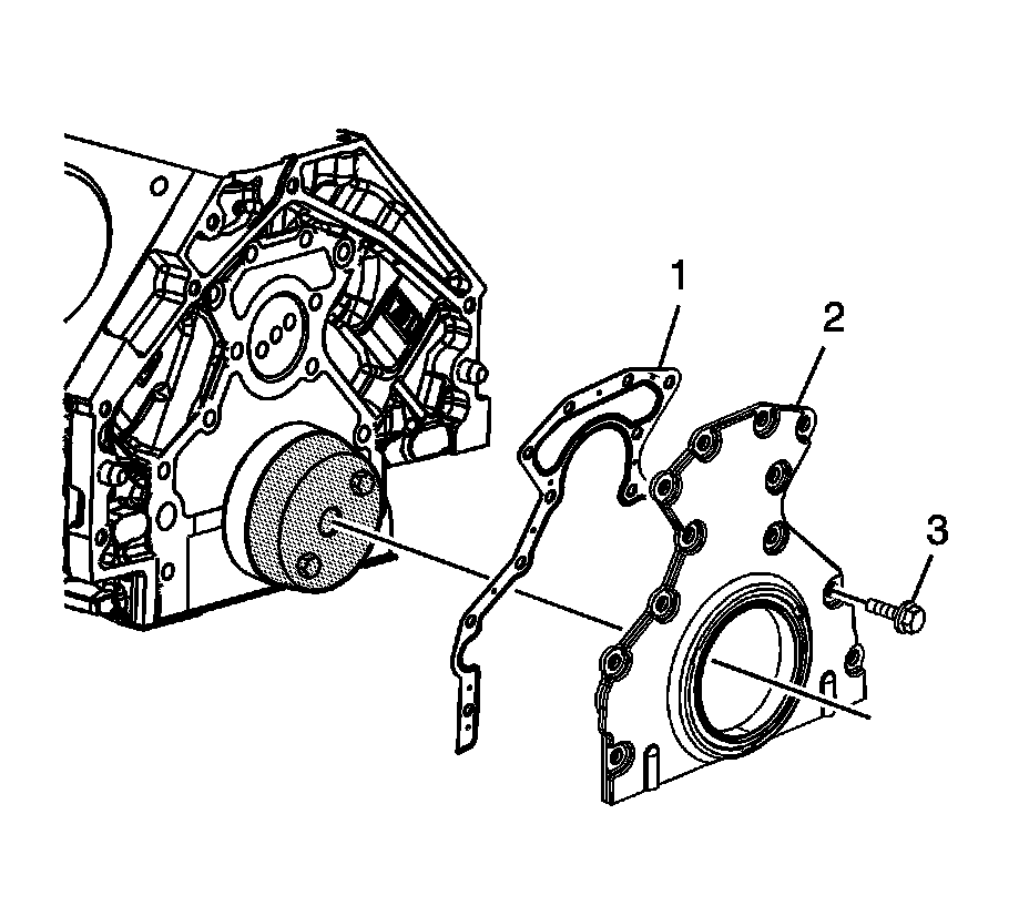 5. Install the rear housing gasket (1), rear housing with seal (2), and bolts (3).
