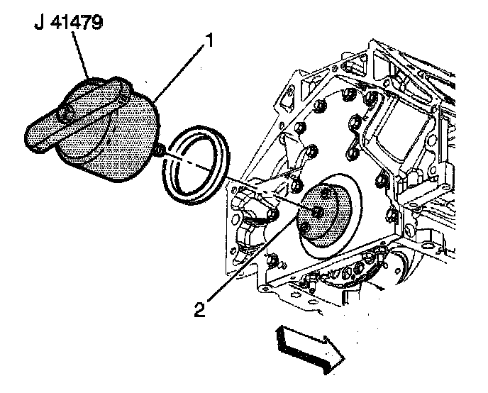 3. Install the J 41479 cone (2) and bolts onto the rear of the crankshaft.