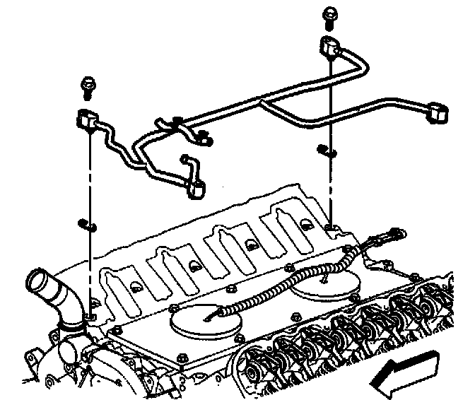 Important: Route the knock sensor wire harness over the top of the engine coolant air bleed pipe. The pipe and knock sensor wire harness should be installed in a manner as to allow the removal of the wire harness without requiring the removal of the pipe.