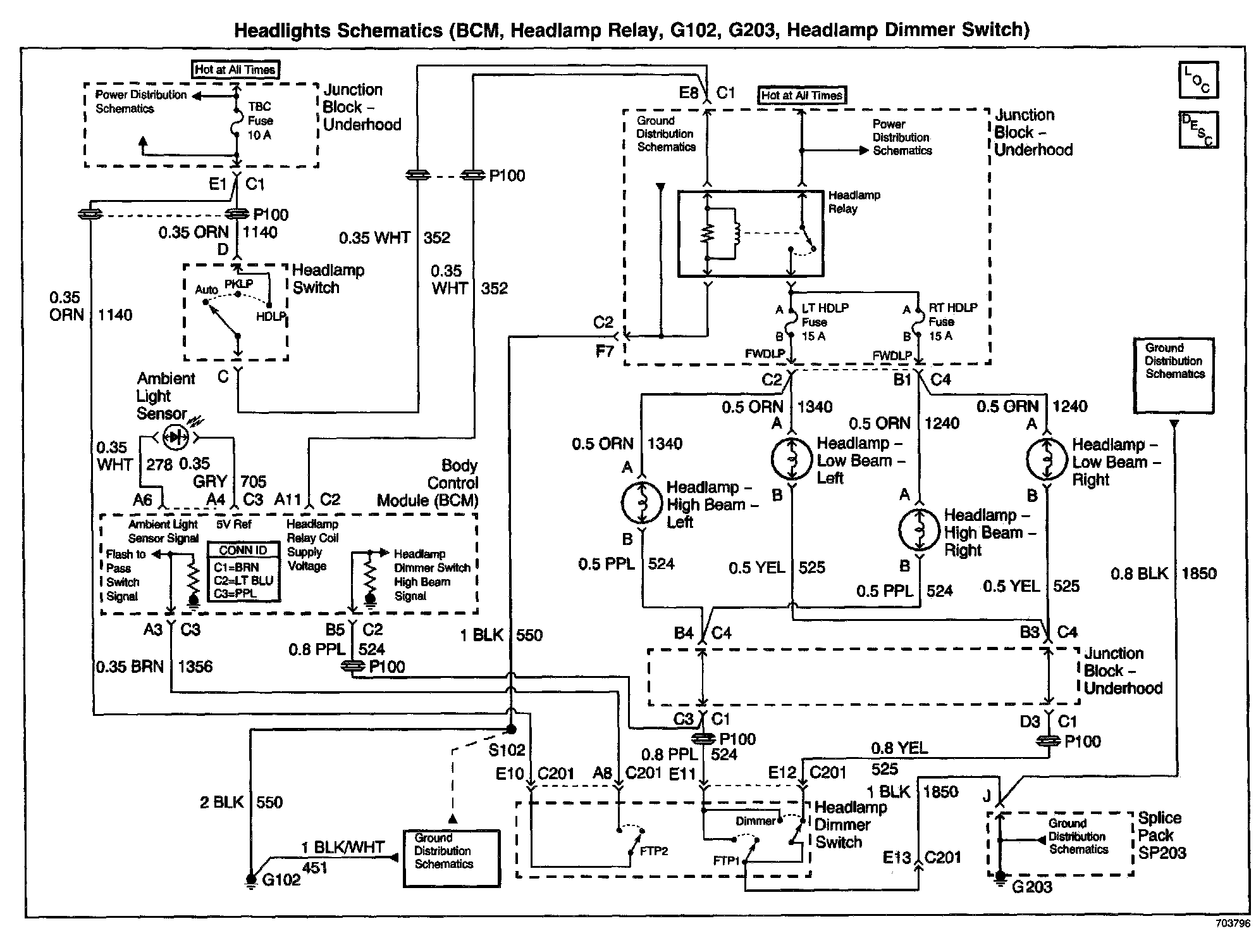 Headlight Schematics: BCM Headlamp Relay, G102, G203, Headlamp Dimmer Switch: