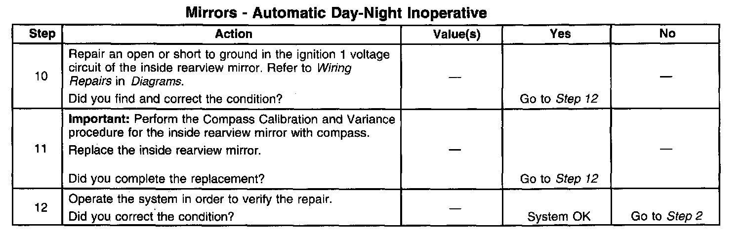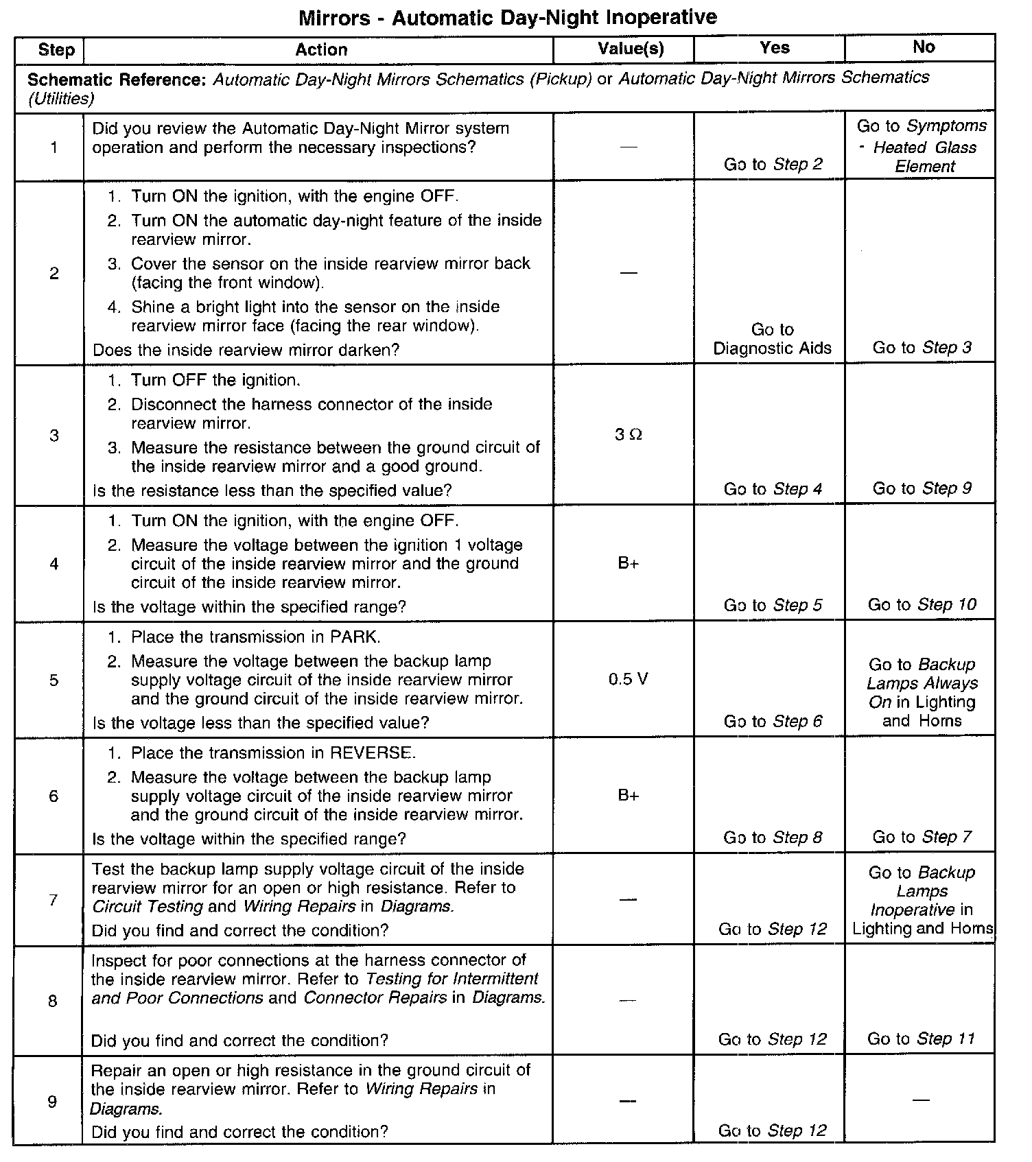 DIAGNOSTIC AIDSThe automatic day-night feature of the inside rearview mirror may not operate properly or become inoperative due to an intermittent short to battery positive voltage in the backup lighting system.