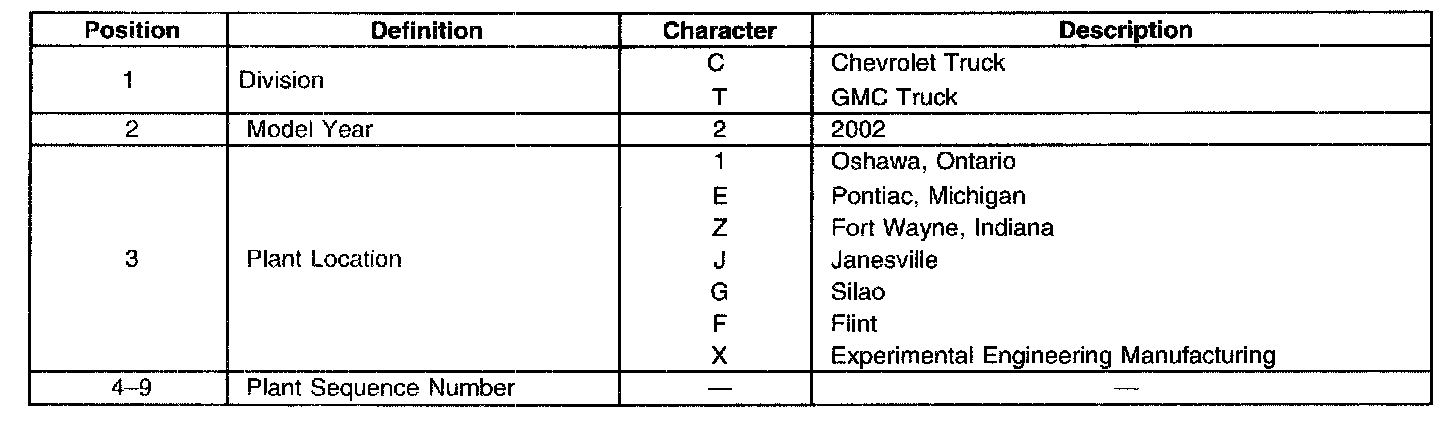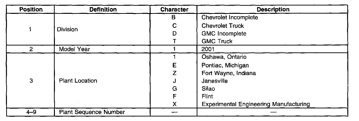 All engines and transaxles are stamped with a partial Vehicle Identification Number (VIN). The following table identities the different VIN derivative characters, character positions, and their respective descriptions.