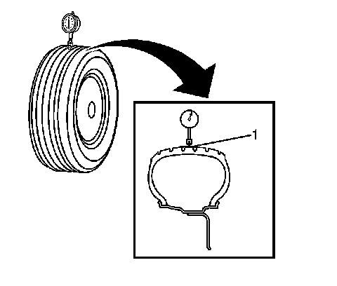 15. For any of the wheel runout measurements which WERE within specifications, while the - tire and wheel - assembly runout measurements were NOT within specifications, replace the tire, then balance the assembly. Refer to Tire and Wheel Assembly Balancing - Off Vehicle.