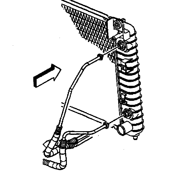 14. If equipped with a 6.0L engine, gently pull the engine oil cooler pipes straight out from the radiator quick connect fittings.