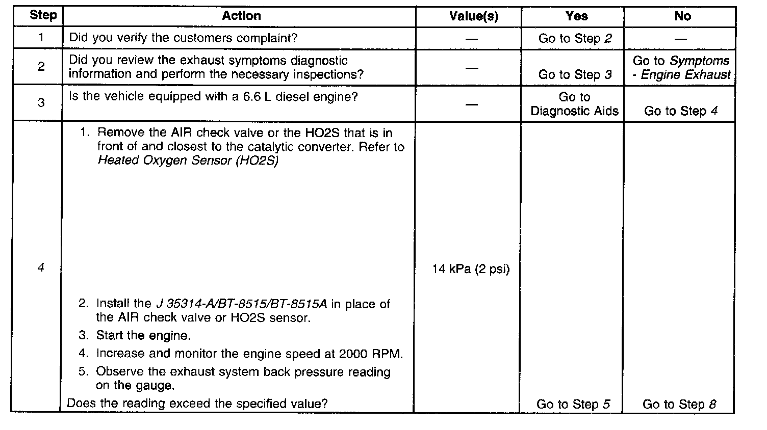 If the vehicle is equipped with a 6.6L diesel engine do not perform this diagnostic. The exhaust system does not have a location for installing the J 35314-AIBT-85151BT-8515A. Instead remove the suspect component, operate the vehicle, verify for improved performance. If performance is improved then replace the faulty component.