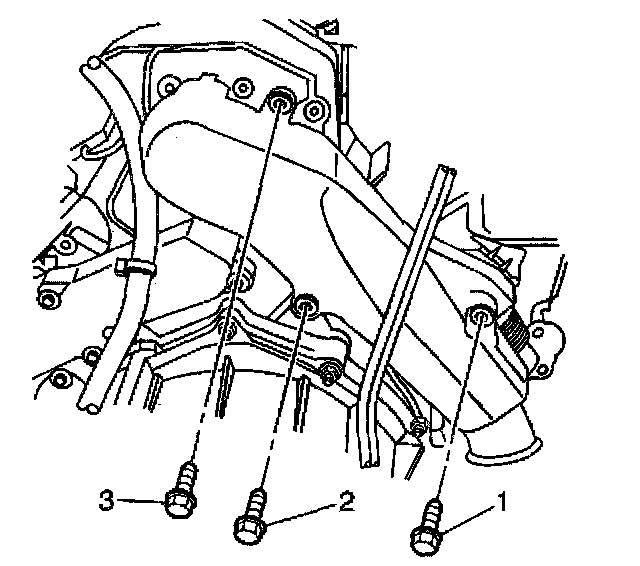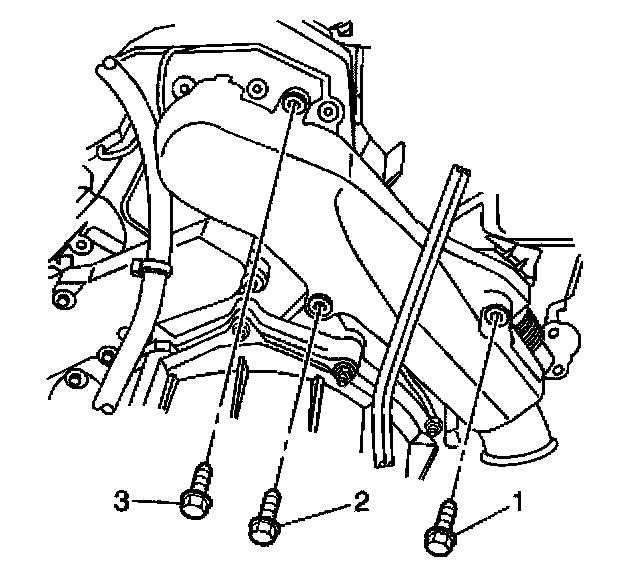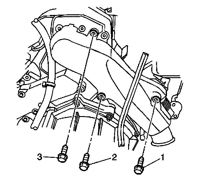 7. Install the upper 2 exhaust outlet heat shield bolts (1, 3).