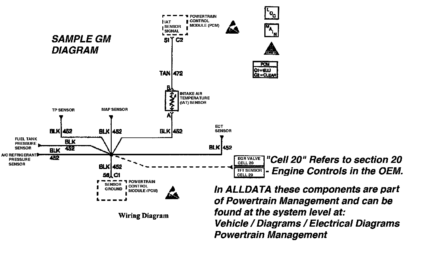 For instance, in the diagram illustrated "Cell 20" is not a reference to another diagram but a reference to "Section 20" in the OE manual. In the example, "Section 20" is the engine control section of the manual.
