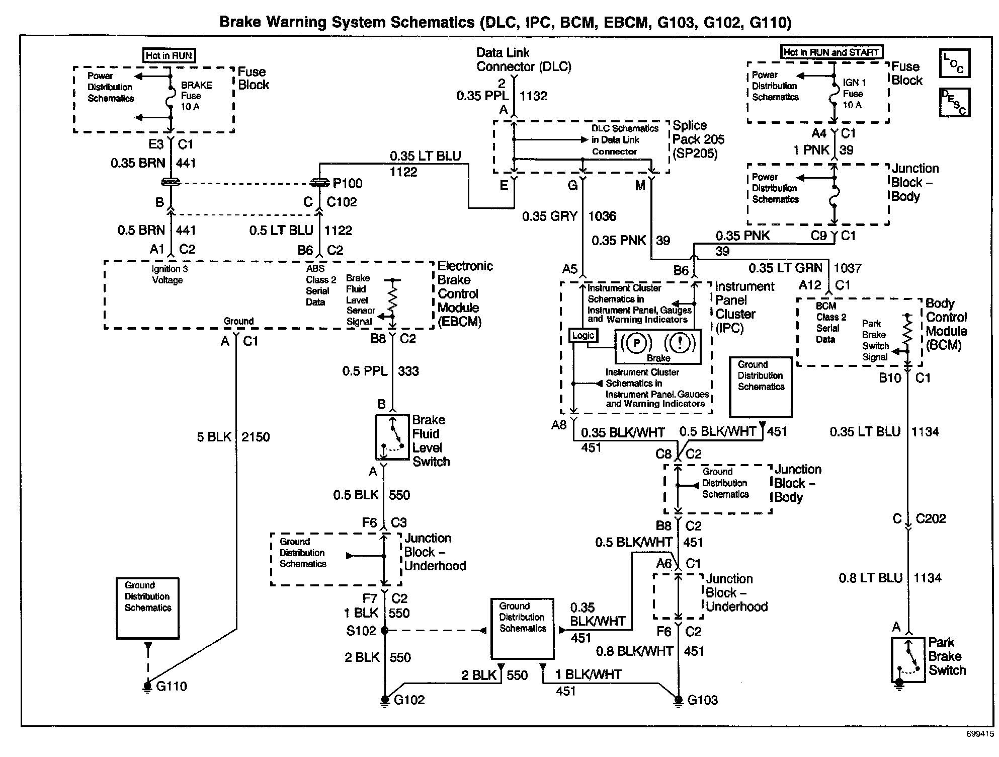 Brake Warning System Schematics: DLC, IPC, BCM, EBCM, G103, G102, G110: