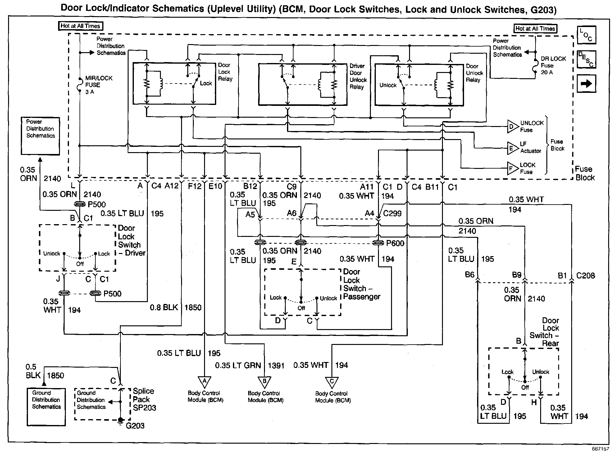 Door Lock/Indicator Schematics: Base Utility (Lock and Unlock Relays, Door Lock Switches, G203):
