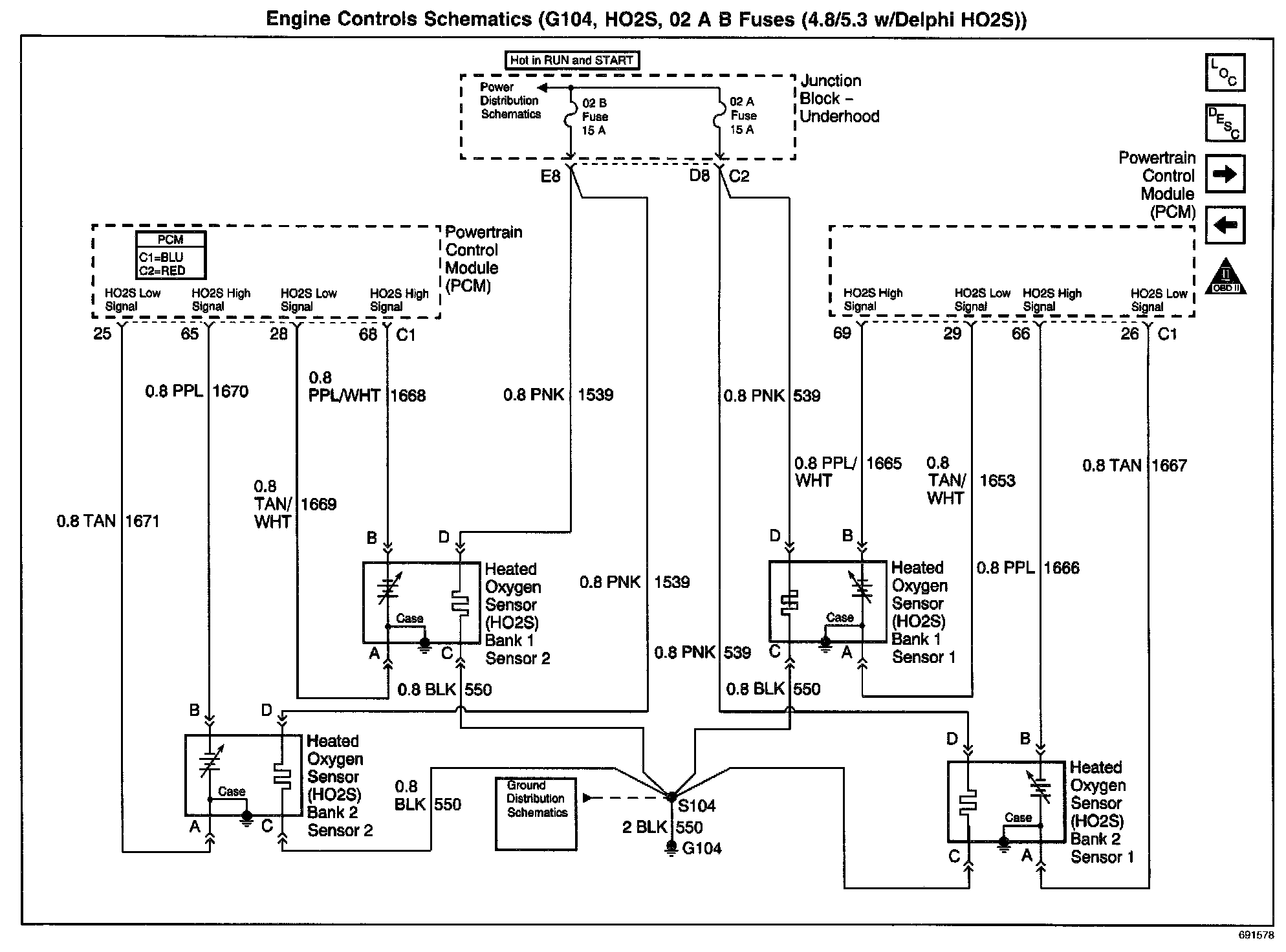 Engine Controls Schematics: G104, HO2S, 02 A B Fuses (4.8/5.3 W/Delphi HO2S):