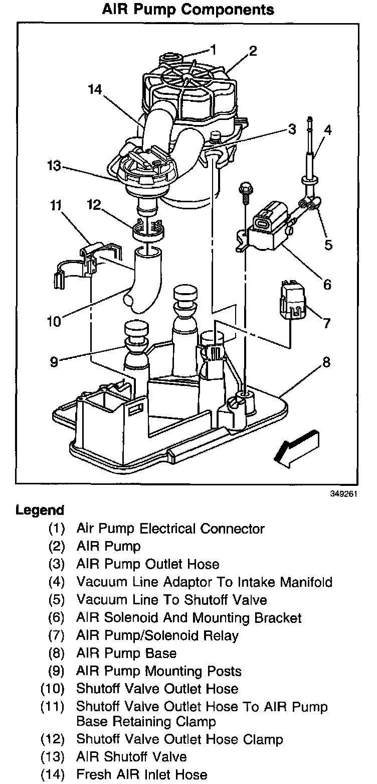 ^ The AIR pump - The AIR pump assembly is mounted in the right rear corner of the engine compartment and supplies the air to the AIR system. The electric air pump sends air to the check valves near the exhaust manifolds. The AIR pump is controlled by the powertrain control module (PCM) through the AIR pump solenoid relay. Battery voltage to the AIR pump is controlled by the AIR pump solenoid relay. A vacuum operated shut off valve prevents air flow during OFF periods. When the PCM provides a ground circuit for the secondary AIR pump solenoid relay, battery voltage applies power to the AIR pump and the solenoid. Intake manifold vacuum is then applied through the solenoid to the vacuum operated shut off valve. The vacuum operated shut-off valve then opens up and allows air to be delivered to the check valves.